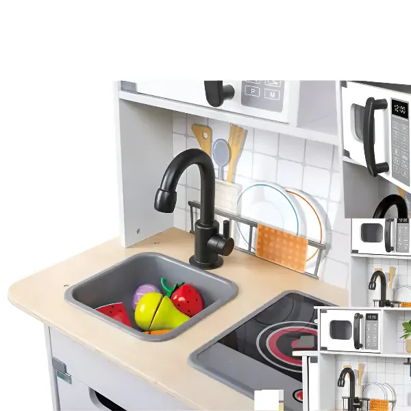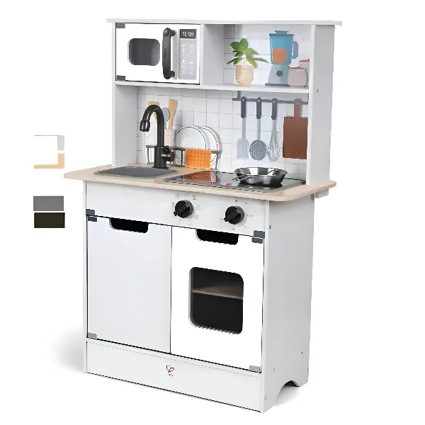 • العلامة التجارية: هابي (HAPE) • العمر: 3+ • لعبة تفاعلية: مجموعة مطبخ تحتوي على شعلات مضيئة، أصوات طبخ واقعية، صنبور متحرك، مقابض فرن قابلة للدوران، وميكروويف بباب قابل للفتح. • لعب تخيلي: تشجع الأطفال على تقمص دور الطهاة وطهي الطعام للضيوف، مما ينمي الإبداع والخيال. • تصميم واقعي: يشمل خلفية مطلية، مقلاة معدنية، ملعقة، فرن، وخزائن لتخزين الطعام والإكسسوارات. • توسعة المرح: يمكن دمجه مع مجموعات مطبخ أخرى لبناء مطبخ الأحلام. • تخزين سهل ومتانة: خزائن لتخزين الإكسسوارات، مصنوعة من خشب متين وأقمشة آمنة للأطفال لضمان اللعب الطويل الأمد.