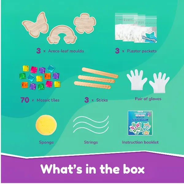 • Brand: Bloomingo • Age: 5+ years • Complete Kit: Comes with 70 colourful mosaic tiles, 3 areca-leaf moulds (butterfly, flower, rainbow), 3 plaster packets, sticks, gloves, sponge, strings, and instructions. • Creative Designs: Allows kids to create 3 beautiful wall hangings featuring vibrant garden-themed shapes. • Skill Development: Helps boost creativity and fine motor skills through engaging, hands-on crafting. • Easy to Make: Simple step-by-step guide ensures an enjoyable and frustration-free crafting experience.