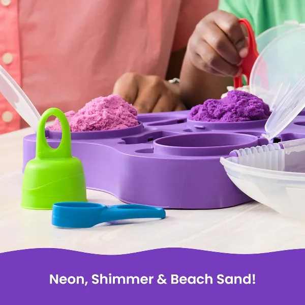 • Brand : KINETIC SAND • 3 Varieties, 5 Colors – Neon (purple, blue & white), shimmer pink, and beach sand for diverse play • Enhance Creativity with 5 Tools – Cut, squish, carve, mold, and flow the sand • Reusable Storage Case – Built-in compartments and snap-in tool spots for organized play • Age Recommendation: 3+